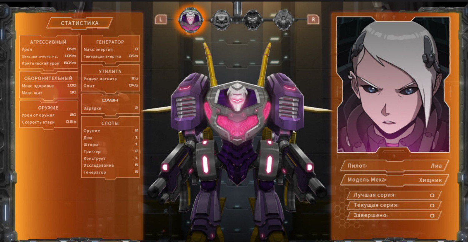 Выберите пилота, привязанного к определенному меху, обладающему различными боевыми и пассивными способностями.