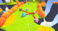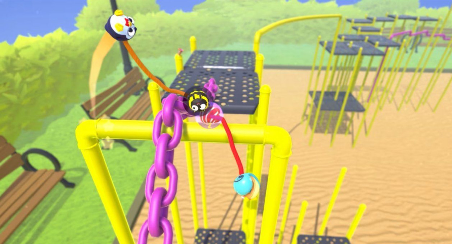 Во Fling to the Finish команды по два игрока проходят сумасшедшие трассы, будучи связанными эластичной верёвкой. Сначала этот «поводок» будет мешать на каждом шагу, но постепенно геймеры освоятся и начнут использовать его в своих интересах. Верёвка позволяет обходить ловушки, вытаскивать напарника из пропасти и даже устраивать акробатические номера, которых нет в других платформерах. Забавы добавляют и гонки против других команд — на одном экране. Каждая трасса оформлена по-своему: то это парящие парки, то гигантские казино, то астероидные поля, где поджидают черви. Препятствия меняются от уровня к уровню, заставляя искать новые способы применения веревки. Fling to the Finish можно проходить вдвоём на одном контроллере, что особенно оживляет локальные сессии. Не стоит расслабляться: соперники могут закидать вас вантузами, гирьками или сбить лазером. Эти пакости уравнивают шансы, если один игрок явно сильнее другого!..