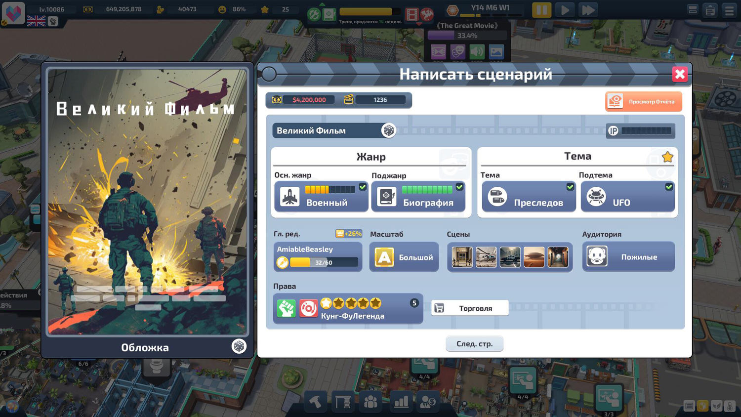 Станьте кинематографическим магнатом в Super Movie Tycoon! От сценария до экрана - соберите команду мечты и покорите Голливуд!